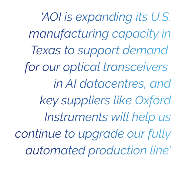 Oxford Instrumentsは、アプライド・オプトエレクトロニクス社(AOI)と提携し、米国における先進的なリン化インジウム(InP)光電子デバイスの生産体制を強化します。 AIデータセンター向け光トランシーバーの需要拡大に対応するため、AOIがテキサス州での事業を拡大する中、Oxford Instrumentsは、効率性、品質、および拡張性を向上させる最先端のプラズマ処理システムを提供します。この提携は、次世代光電子デバイスの製造におけるイノベーションを推進するという両社の取り組みを裏付けるものです。