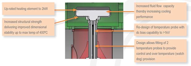 Up-rated heating element to 2kW Delivers more heat to the electrode thereby reducing temperature ramping times, increased element lifetime and improved temperature uniformity over the upper surface